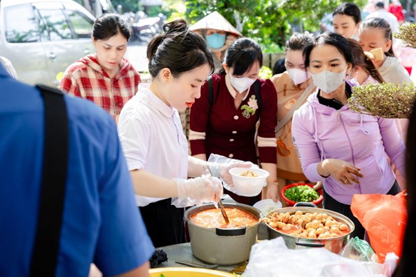 Sự kiện càng thêm ấm áp khi 500 suất ăn miễn phí được chuẩn bị với món mì Quảng và cacao sữa – những hương vị vừa quen thuộc, vừa đầy ắp yêu thương. Bữa ăn không chỉ làm dịu cái đói, mà còn khiến mọi người gần nhau hơn trong sự gắn kết đầy cảm động giữa đoàn thiện nguyện và người dân địa phương.