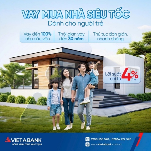 Không chỉ dừng lại ở sản xuất – kinh doanh, VietABank còn hướng đến nhu cầu an cư của người dân, đặc biệt là người trẻ. Chương trình “Vay mua nhà siêu tốc – Dành cho người trẻ” gây chú ý với lãi suất chỉ từ 4%/năm, cùng thời gian vay lên đến 30 năm.
